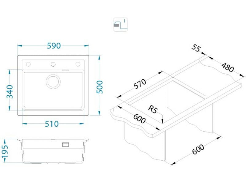 Alveus ATROX 30 Composite Inset/Undermount Kitchen sink, 590 x 500 Carbon or Arctic