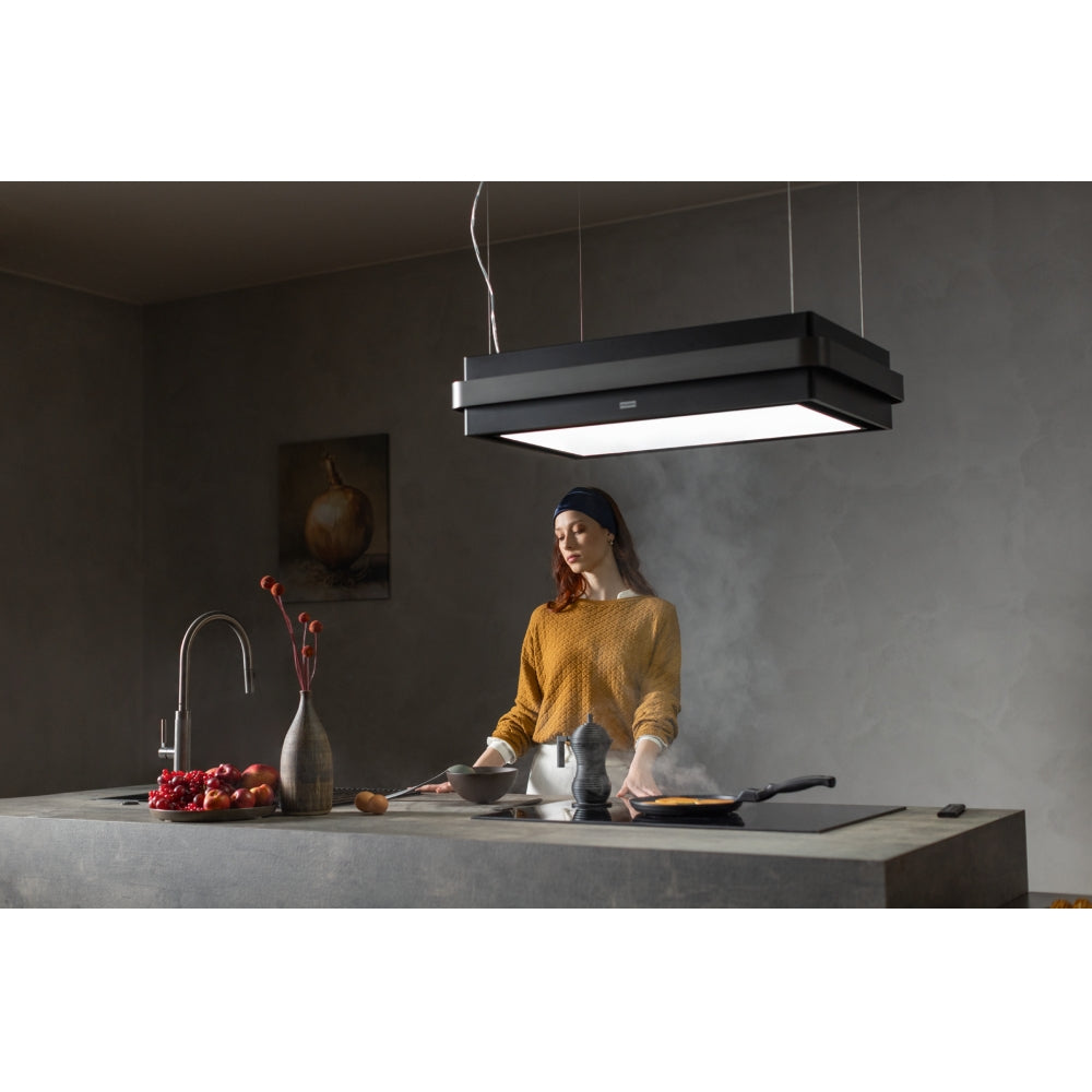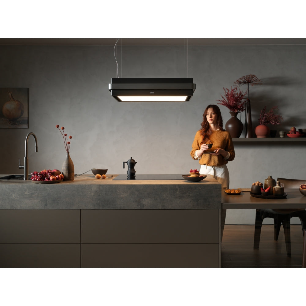 Mythos Masterpiece Suspended Anthracite, FMYS BK/AN F80 KL, Elevate your kitchen ambiance with the Franke Mythos Masterpiece Suspended Hood, crafted to captivate with contemporary design and profiles available in three striking finishes: Anthracite, Gold, and Copper. Suspended Design - Suspended Hood is perfect for those looking to make a bold statement. This island hood transforms itself into a centerpiece thanks to the elegant decorative ring and unique design. Designed with practicality in mind, it comes with durable, long-lasting charcoal filters that ensure consistently clean air. Innovative Lighting - The Suspended model offers a full light panel, giving you freedom to choose between task lighting for cooking and soft ambient light for a cozy atmosphere. Sophisticated Connectivity - Featuring K-Link connectivity, this hood effortlessly synchronises with your Masterpiece hob, delivering perfect ventilation control for an unparalleled cooking experience.