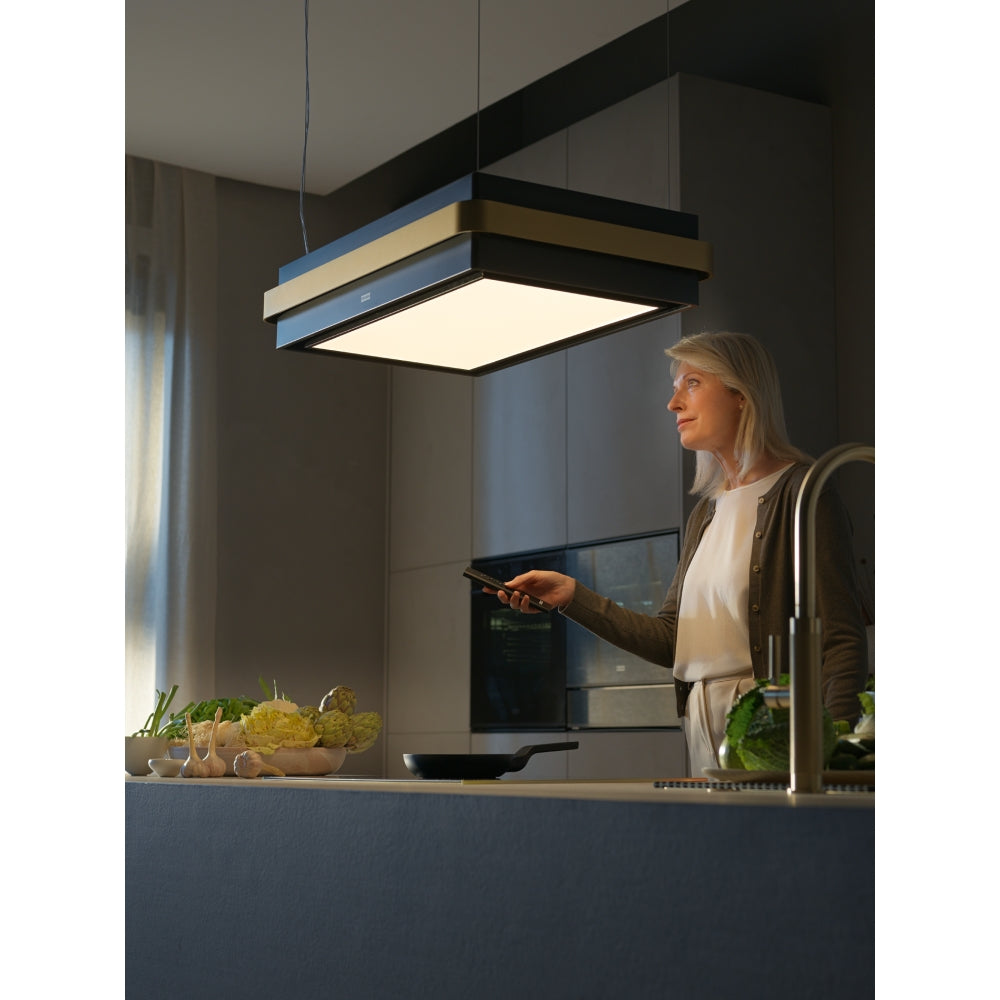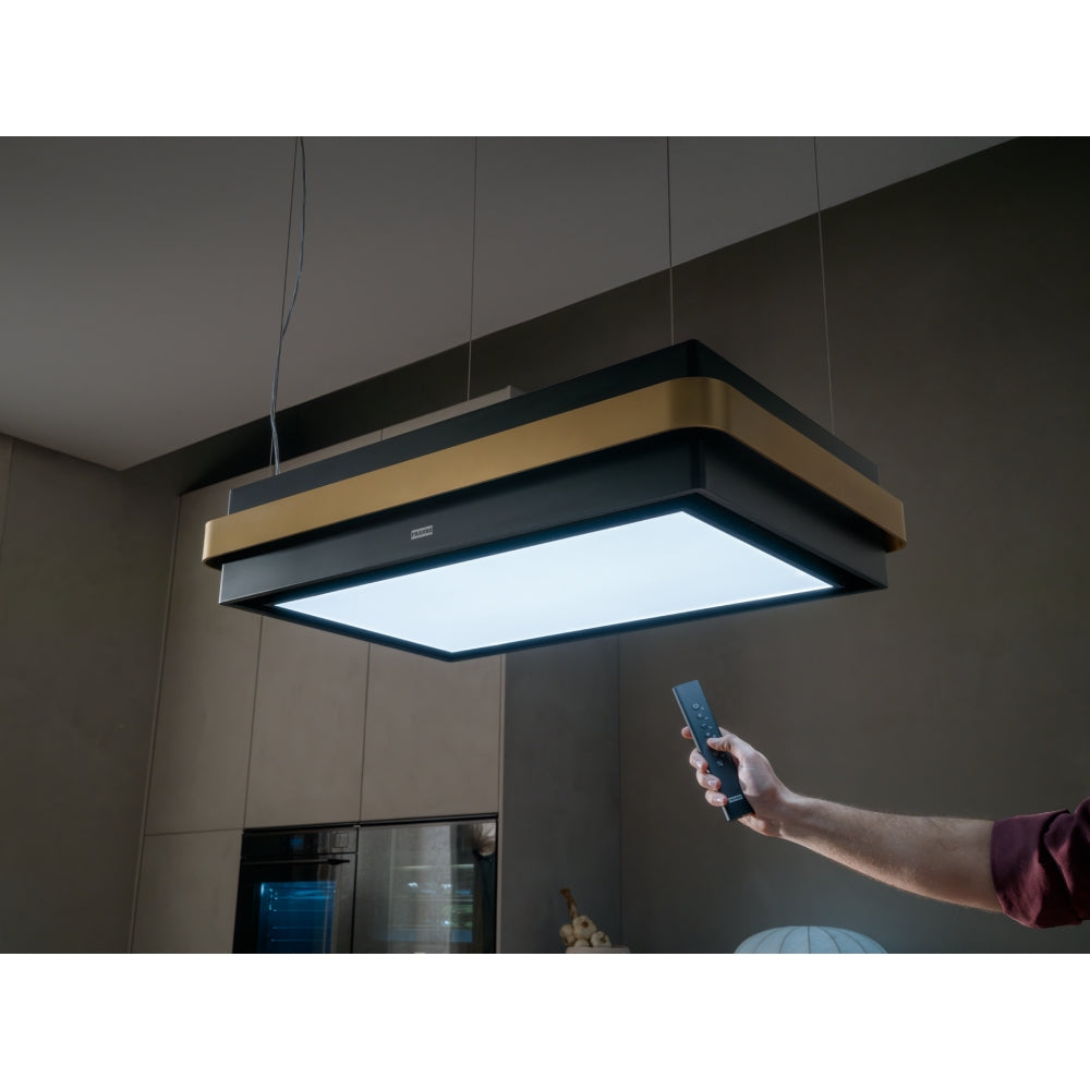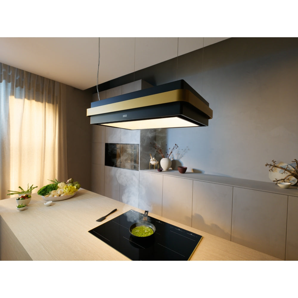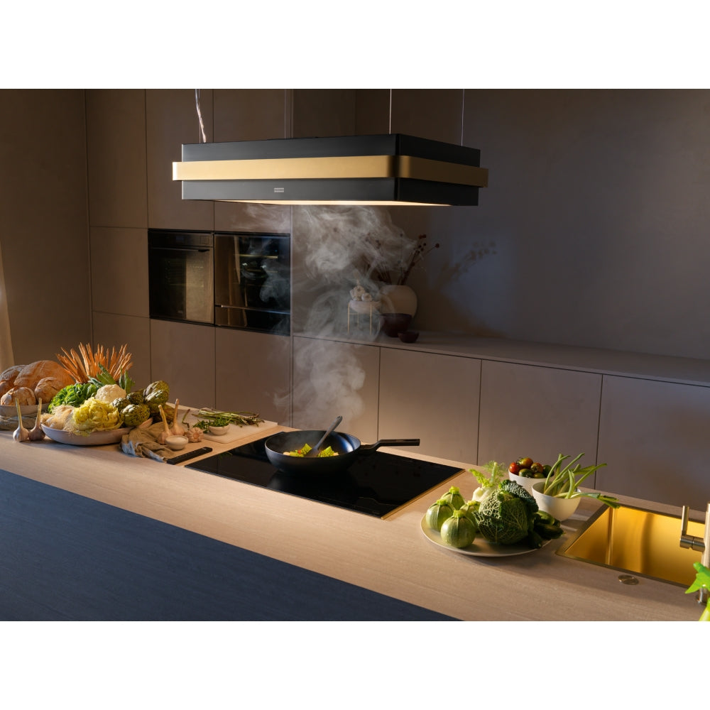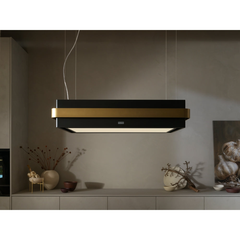 Mythos Masterpiece Suspended Gold, FMYS BK/GD F80 KL, Elevate your kitchen ambiance with the Franke Mythos Masterpiece Suspended Hood, crafted to captivate with contemporary design and profiles available in three striking finishes: Anthracite, Gold, and Copper. Suspended Design - Suspended Hood is perfect for those looking to make a bold statement. This island hood transforms itself into a centerpiece thanks to the elegant decorative ring and unique design. Designed with practicality in mind, it comes with durable, long-lasting charcoal filters that ensure consistently clean air. Innovative Lighting - The Suspended model offers a full light panel, giving you freedom to choose between task lighting for cooking and soft ambient light for a cozy atmosphere. Sophisticated Connectivity - Featuring K-Link connectivity, this hood effortlessly synchronises with your Masterpiece hob, delivering perfect ventilation control for an unparalleled cooking experience.