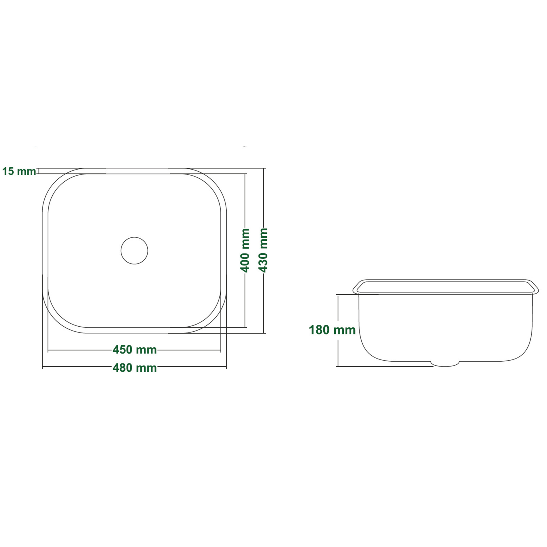 About this item Kitchen sink Installation: under-mount, flush surface or installation Material: Satin Stainless Steel Grade: Stainless SAE 304 - 18/8 - A2 Food grade metal thickness: 0.8 mm The drain hole has a diameter of 90mm. Base cabinet: from 500 mm Sound absorbing pads Use silicone adhesive for fixing and sealing for all installation methods Box contents: kitchen sink, drain fitting, siphon, basket strainer, plug and overflow