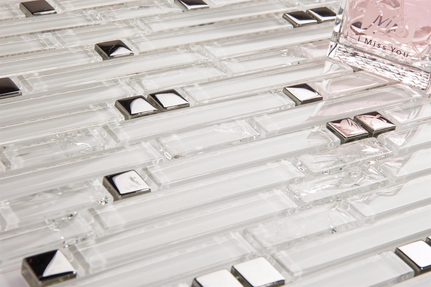 Superwhite Plain & Crackle and Silver Glass Brick Shape Mosaic Tiles (MT0139)